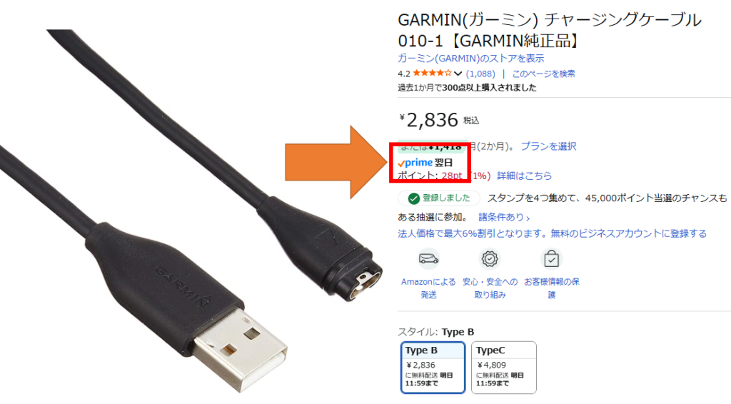 ガーミンスマートウォッチの充電ケーブルは2種類(TypeBとTypeC)あります。